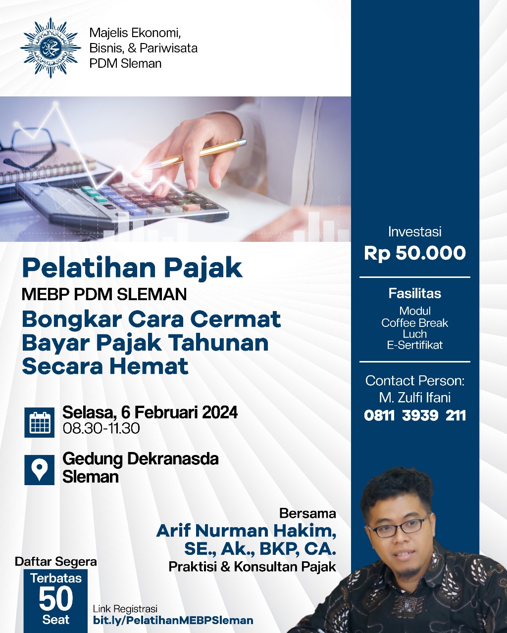 Sleman, Pdmsleman.Or.Id SPT tahunan kadang bikin bimbang. Kalau tak dibayarkan jadi beban, tapi kalau dibayarkan kok menipis pendapatan usaha kita. Tentunya setiap pengusaha ingin berhemat dalam hal apapun, termasuk dalam membayar pajak tahunan. Terlebih lagi bagi para pengusaha wajib pajak badan maupun wajib pajak pribadi yang penghasilannya sudah melebihi penghasilan tidak kena pajak. Bagaimana cara menghematnya?Jangan sampai menyalahi aturan!Pelajari ilmunya secara lengkap di Pelatihan Pajak bersama MEBP PDM Sleman. Investasi hanya Rp 50.000(Modul, Snack, Lunch & E-Sertifikat) 🎙️ Arif Nurman Hakim, SE., Ak., BKP, CA.(Praktisi & Konsultan Pajak) 🗓️ Selasa, 6 Februari 2024⏰ 08.30 – 11.30 WIB📍Gedung Dekranasda Slemanhttps://maps.app.goo.gl/RgzqNHgumivDTKMo9 DAFTAR SEGERA, TERBATAS HANYA 50 SEATLink Registrasibit.ly/PelatihanMEBPSleman Contact Person:MZ Ifani (0811-3939-211) Diselenggarakan oleh:MEBP PDM Sleman
