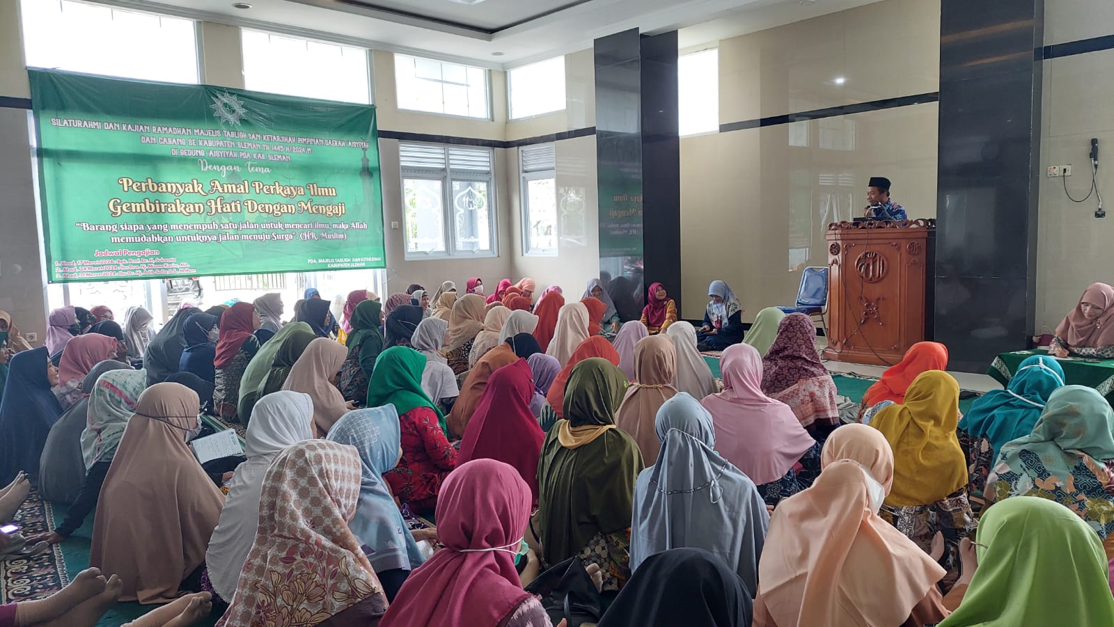 Ngaglik, Pdmsleman.Or.Id Ahad, 17 Maret 2024 bertempat di Masjid Aisyiyah Darussalam Ngepas Ngaglik Sleman digelar kajian ramadan oleh Majlis Tabligh dan Tarjih PDA Sleman. Tema “Perbanyak amal Perkaya ilmu Gembirakan hati dengan mengaji” menginspirasi kajian yang dihadiri 170 anggota Aisyiyah se kabupaten Sleman ini semarak dan semangat. Prof.Dr. H. Sukamto, M.Ag dalam kajian putaran pertama hari ini mengantarkan bagaimana seharusnya perempuan berperan dalam dakwah transformasi digital. “ Era digital tak bisa kita hindari, kita ada didalamnya. Handphone dan alat lain tiap hari telah berperan dalam melaksanakan tugas kita. Facebook, youtube, instagram, tiktok, twiter menjadi media strategis untuk berdakwah”. Hanik Rosyada ketua PDA dalam sambutan pengantarnya “mengajak ibu-ibu Aisyiyah untuk semangat berdakwah bersama Aisyiyah, melalui medsos kita optimalkan semampu kita”. Sri Sumiarsi sebagai wakil ketua mengajak Aisyiyah untuk kembali ke HPT amalan kita. Praktis namun luar biasa hikmahnya. Reportase Hj. Hanik Rosyada M.Pd, Ketua PDA Sleman