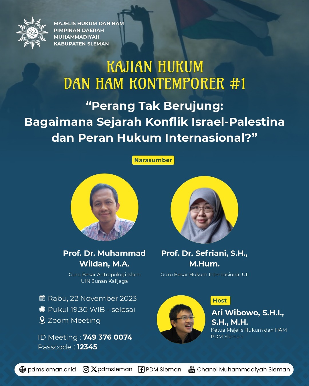 Sleman, Pdmsleman.Or.Id Konflik Israel-Palestina berlangsung sudah sangat lama, dan tidak berkesudahan sampai dengan hari ini. Bahkan beberapa hari terakhir ini terjadi perang besar yang menimbulkan banyak korban. Sudah tidak terhitung lagi berapa nyawa yang telah melayang akibat konflik tersebut, belum lagi kerugian harta benda. Gempuran Israel yang membabi buta telah merenggut nyawa warga sipil, anak-anak, perempuan, dan petugas kesehatan. Meskipun masih ada beberapa negara yang mendukung Israel, namun demo anti-Israel terjadi secara masif di berbagai belahan dunia termasuk Indonesia. Untuk mengetahui sejarah panjang konflik Israel-Palestina, serta bagaimana peran hukum Internasional, Majelis Hukum dan Hak Asasi Manusia (MHH) Pimpinan Daerah Muhammadiyah (PDM) Sleman DIY menyelenggarakan Kajian Hukum dan HAM Kontemporer #1: “Perang Tak Berujung: Bagaimana Sejarah Konflik Israel-Palestina dan Peran Hukum Internasional?” pada Rabu, 22 November 2023 secara daring melalui zoom meeting. Hadir dalam diskusi tersebut 2 Guru Besar sebagai narasumber, yaitu Prof. Dr. Muhammad Wildan, M.A. (Guru Besar Antropologi Islam UIN Sunan Kalijaga). dan Prof. Dr. Sefriani, S.H., M.Hum. (Guru Besar Hukum Internasional UII), dengan dipandu Ari Wibowo, S.H.I., S.H., M.H. (Ketua MHH PDM Sleman) selaku host. Prof. Wildan menyampaikan secara panjang lebar mengenai sejarah terjadinya konflik Israel-Palestina, kemudian siapa etnis Israel dan Palestina, sejak kapan terjadi konflik, hak atas tanah Palestina, hingga solusi yang mungkin bisa ditempuh untuk mengatasi konflik 2 negara tersebut. “Secara historis, etnis Israel juga memiliki hak atas wilayah Palestina-Yerusalem. Sebenarnya Palestina sudah menerima pembagian wilayah Palestina sesuai yang telah disepakati, tetapi Israel terus memperluas wilayah pemukiman Yahudi,” jelasnya. Menurut Prof. Wildan, dalam mengatasi konflik Israel-Palestina diperlukan keterlibatan lembaga-lembaga internasional yang netral untuk mendamaikannya. Adapun Prof. Sefriani banyak menjelaskan pelanggarakan-pelanggaran Israel di Gaza terhadap Hukum Internasional, akar masalah terjadinya konflik, peran Hukum Internasional, dan solusi 2 negara. “Awal mula terjadinya konflik karena pencaplokan wilayah Palestina oleh zionis Israel yang kemudian berkembang ke isu agama, etnis, ras, budaya, pelanggaran HAM, dan lain sebagainya sehingga menjadi sangat kompleks,” ujarnya. “Banyak pelanggaran yang dilakukan Israel selama terjadinya konflik, mulai dari genosida fisik dan budaya, kejahatan terhadap kemanusiaan, kejahatan perang, dan pelanggaran-pelanggaran lainnya terhadap Hukum Internasional. PBB sudah berulang kali mengeluarkan resolusi namun Israel tetap tidak bergeming,” tambahnya. Ia menyayangkan Amerika Serikat yang menggunakan standar ganda dalam menyikapi konflik antar 2 negara. Amerika Serikat tegas terhadap Rusia dan Irak misalnya, namun tidak dengan Israel. Oleh karena itu, Prof. Sefriani menyerukan pemberian sanksi sepihak kepada Israel melalui saluran diplomasi dan sanksi ekonomi, misalnya boikot produk Israel dan afiliasi pendukungnya secara selektif. Ketua MHH PDM Sleman, Ari Wibowo, yang juga bertindak selaku host acara mengaku sangat senang karena diskusi dihadiri banyak peserta dari berbagai daerah hingga mencapai batas maksimal kuota zoom meeting. “Kuota zoom meeting maksimal hanya 300 dan alhamdulillah langsung penuh. Banyak yang tidak kebagian kuota dan meminta video diupload melalui youtube. InsyaAllah MHH PDM Sleman akan secara periodik menyelenggarakan diskusi dengan topik-topik kekinian lain yang terkait dengan hukum dan HAM. Dengan diskusi semacam ini, kami berharap bisa meningkatkan kesadaran dan kepedulian masyarakat terhadap isu-isu hukum dan HAM, serta memberikan kontribusi positif sesuai dengan kemampuan dan bidang masing-masing,” tutupnya. Reportase DR. Ari Wibowo MHH PDM Sleman Editor Arief Hartanto MPI PDM Sleman